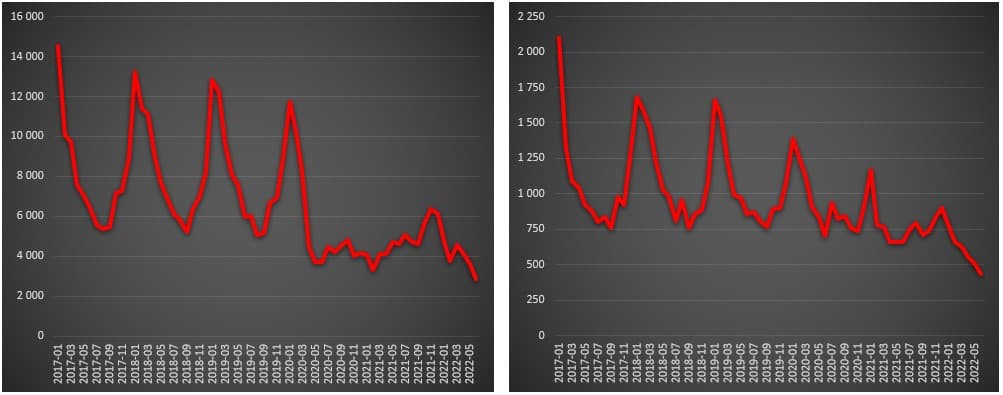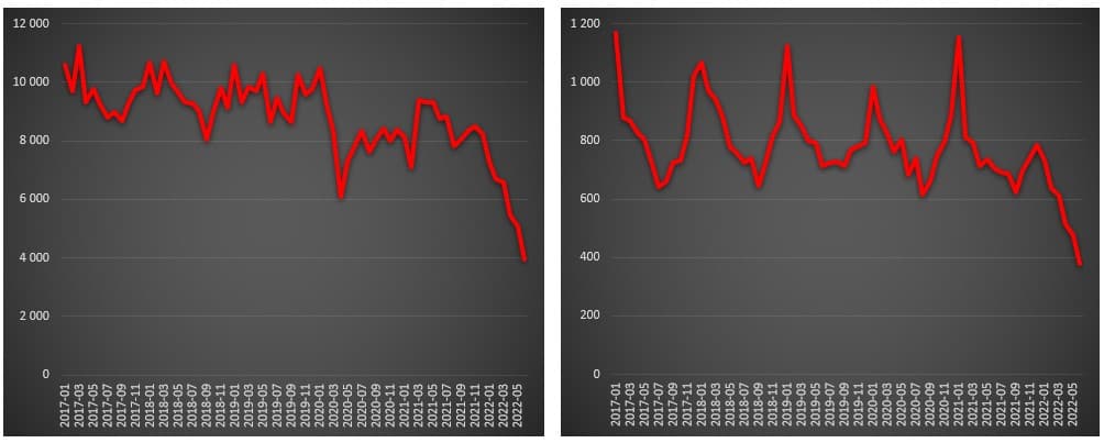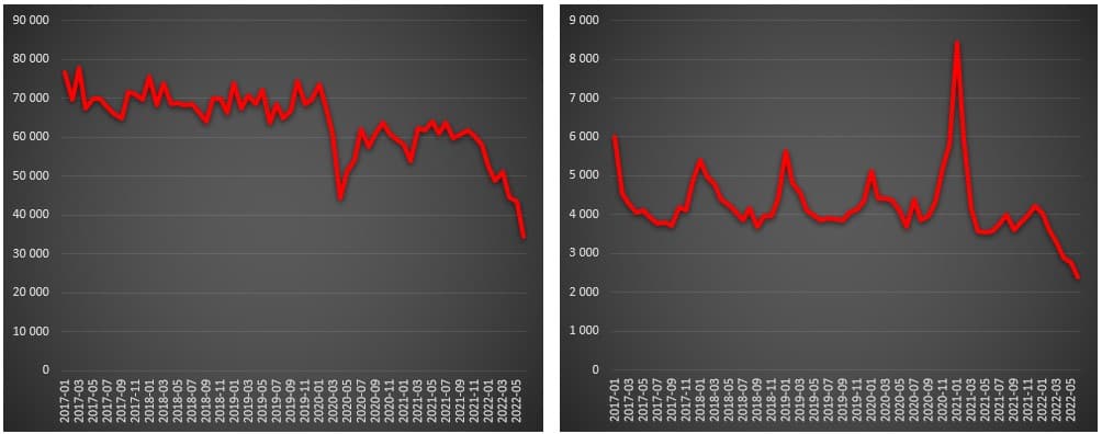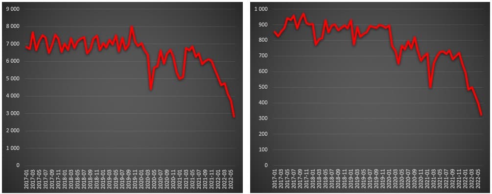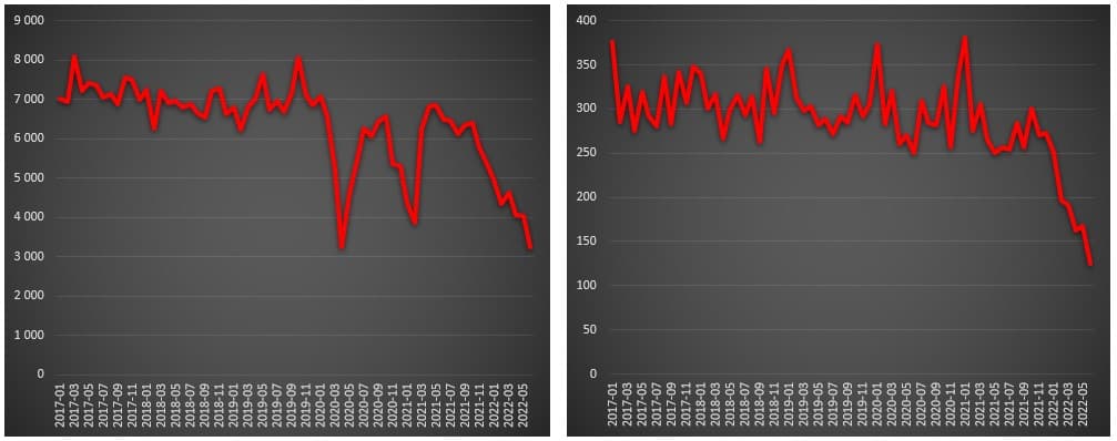 Em termos globais, verifica-se que, desde Janeiro de 2017 – a partir do qual a BDMMH disponibiliza informação –, o mês de Junho de 2022 é o mês que regista o menor número de internamentos (34.487) e o menor número de óbitos (2.394), segundo uma tendência fortemente decrescente a partir de Dezembro do ano passado.
