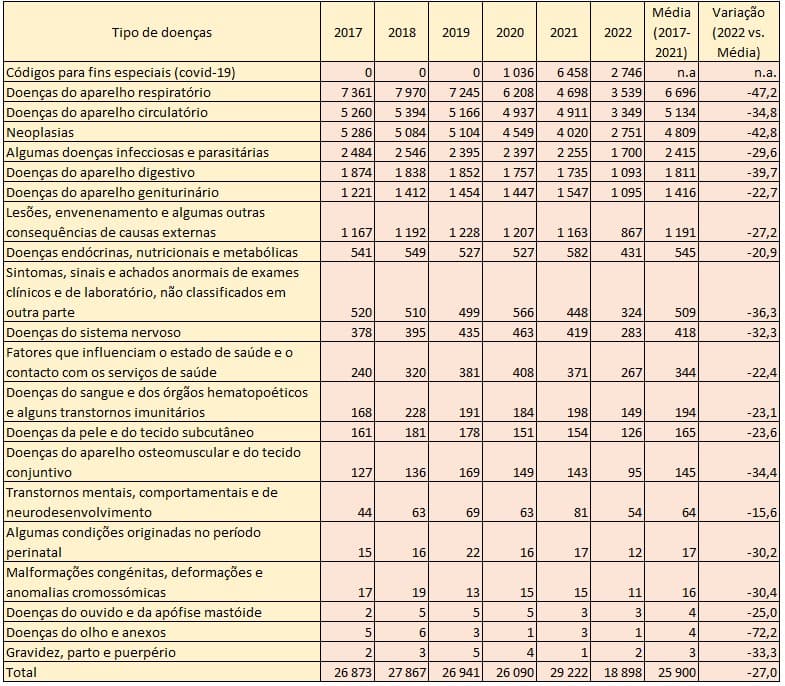 No caso das doenças do aparelho respiratório, a variação é de 47% face ao último quinquénio e de 25% face a 2021, que já fora um ano pouco mortífero, uma vez que as pneumonias virais e bacterianas se reduziram com o surgimento da covid-19.
