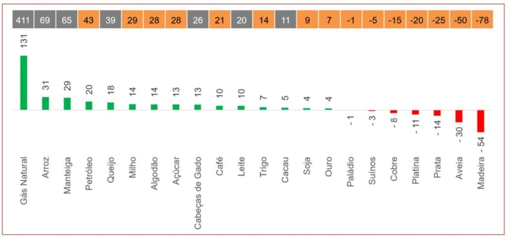 Para o mesmo período, a madeira subiu 323%, ao ritmo de 113% por ano, o gás natural 169%, ao ritmo anual de 68%, a aveia 155%, ao ritmo anual de 64%, e por aí fora.