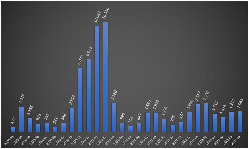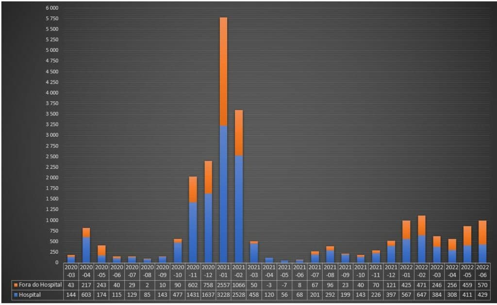 Contudo, nos quatros meses em que se mostra possível comparar três anos sucessivos (Março a Junho), verifica-se que 2022 (já com vacinação plena, incluindo reforços, em quase toda a população “vacinável”) foi aquele com maior número de óbitos por covid-19 (3.063), contrastando com os 750 óbitos em 2021 (contudo, após o morticínio de Janeiro e Fevereiro) e com os 1.579 óbitos de 2020 (no início da pandemia).