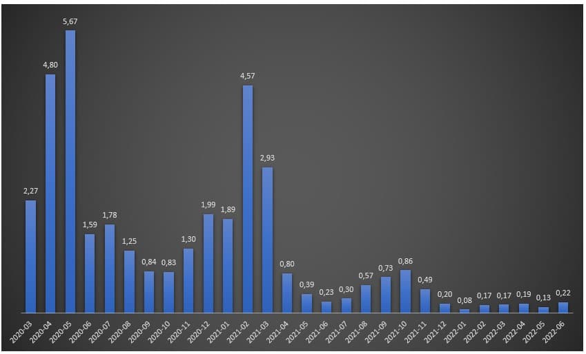 E eis que a seguir, repentinamente, baixou de novo, quedando-se nos 0,49% em Novembro, e depois ainda se reduziu nos meses seguintes. Ao longo de 2022, a taxa de letalidade da covid-19 variou entre os 0,08% em Janeiro e os 0,22% em Junho.