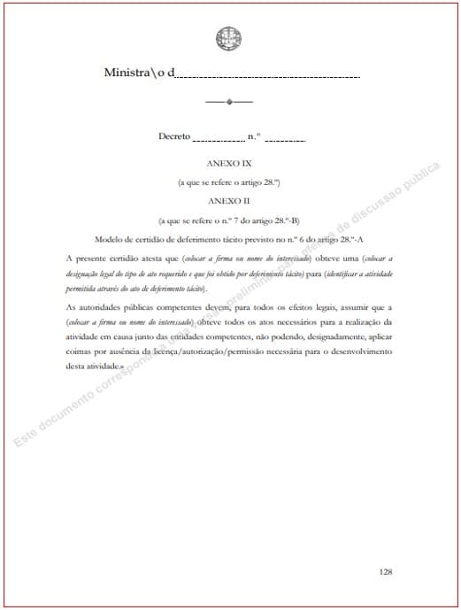 Reza assim: “A presente certidão atesta que (colocar a firma ou nome do interessado) obteve uma (colocar a designação legal do tipo de ato requerido e que foi obtido por deferimento tácito) para (identificar a atividade permitida através do ato de deferimento tácito). As autoridades públicas competentes devem, para todos os efeitos legais, assumir que a (colocar a firma ou nome do interessado) obteve todos os atos necessários para a realização da atividade em causa junto das entidades competentes, não podendo, designadamente, aplicar coimas por ausência da licença/autorização/permissão necessária para o desenvolvimento desta atividade.”