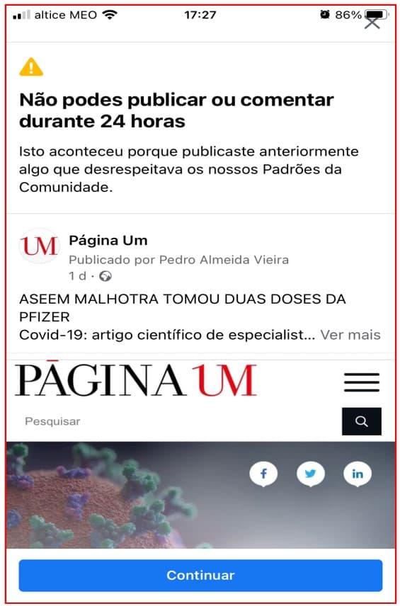 O PÁGINA UM acabou esta tarde por ver censurado pelo Facebook a divulgação naquela rede social de uma notícia que publicou ontem intitulado “Covid-19: artigo científico de especialista em medicina baseada na evidência pede suspensão da administração de vacinas por razões de segurança”.