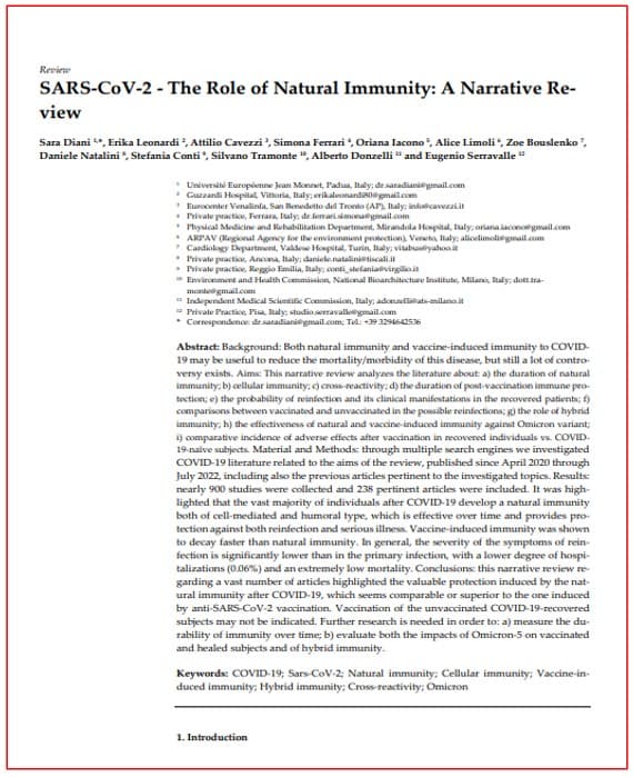 Intitulado “SARS-CoV-2 – O papel da imunidade natural: uma revisão narrativa” (SARS-CoV-2 – the role of natural immunity: a narrative review), este artigo científico de 29 páginas – que tem como primeira autora Sara Diani, da Universidade Europeia Jean Monnet de Pádua – debruça-se sobretudo em analisar a evolução da imunidade vacinal e da imunidade natural, bem como dos riscos das reinfecções e das vacinas contra a covid-19.