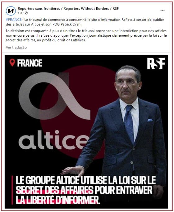 Mas há casos cada vez mais graves, e que transcendem matérias de Saúde e as redes sociais. Na semana passada, a Repórtes Sem Fronteiras denunciou que o Tribunal do Comércio francês ordenou que o jornal Reflets parasse de publicar artigos sobre o grupo Altice e o seu presidente-executivo, Patrick Drahi. A RSF considera a decisão uma “violação da lei da Imprensa”, não apenas porque “o tribunal impõe uma proibição em relação a artigos ainda não publicados” mas também por recusar “aplicar a excepção jornalística especificada na lei sobre segredo comercial”.