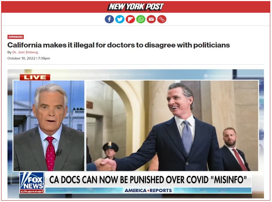 Entretanto, do outro lado do Atlântico, no estado norte-americano da Califórnia, uma nova lei prevê a punição dos médicos que se oponham ou meramente questionem as políticas de saúde oficiais. Sim, leu bem. O estado da Califórnia tornou ilegal que qualquer médico discorde do governo em matérias sobre saúde. Se ainda não está chocado, vamos prosseguir.