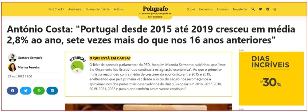 Na passada quinta-feira, o fact-checker (verificador de factos) Polígrafo, financiado a mais de 90% pelo Facebook, escrutinou como verdadeira a afirmação do primeiro-ministro António Costa de que “Portugal desde 2015 até 2019 cresceu em média 2,8% ao ano, sete vezes mais do que nos 16 anos anteriores“.