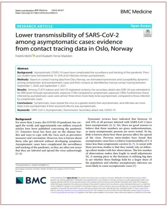 Em artigo científico publicado ontem em prestigiada revista científica, investigadores do Instituto Norueguês de Saúde Pública concluíram que pessoas sem sintomas transmitem muito menos o SARS-CoV-2. Além disso, quando ocorre contágio nestas circunstâncias, a probabilidade de originar formas de doença menos grave (assintomáticos) é três vezes superior. O estudo norueguês revelou também que os casos assintomáticos eram, em média, mais frequentes nas faixas etárias jovens, em homens e em pessoas com menos doses de vacina em comparação com os casos sintomáticos.