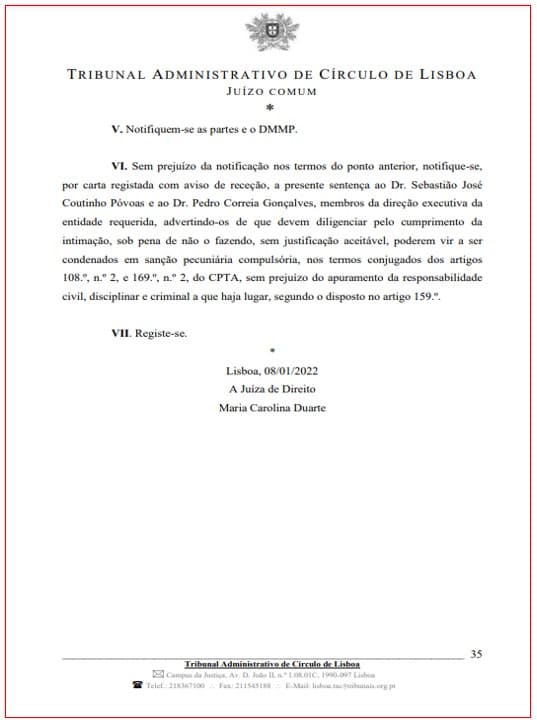Além da condenação ao pagamento das custas processuais, a juíza determinou a notificação da sentença ao “Dr. Sebastião José Coutinho Póvoas e ao Dr. Pedro Correia Gonçalves, membros da direção executiva da entidade requerida [ERC], advertindo-os de que devem diligenciar pelo cumprimento da intimação, sob pena de não o fazendo, sem justificação aceitável, poderem vir a ser condenados em sanção pecuniária compulsória (…), sem prejuízo do apuramento da responsabilidade civil, disciplinar e criminal a que haja lugar”.