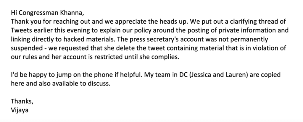 Numa troca humorística no dia 1, o congressista democrata Ro Khanna contacta Gadde para sugerir gentilmente que falem ao telefone. Khanna foi o único [congressista] democrata que encontrei nos ficheiros que expressava preocupação.