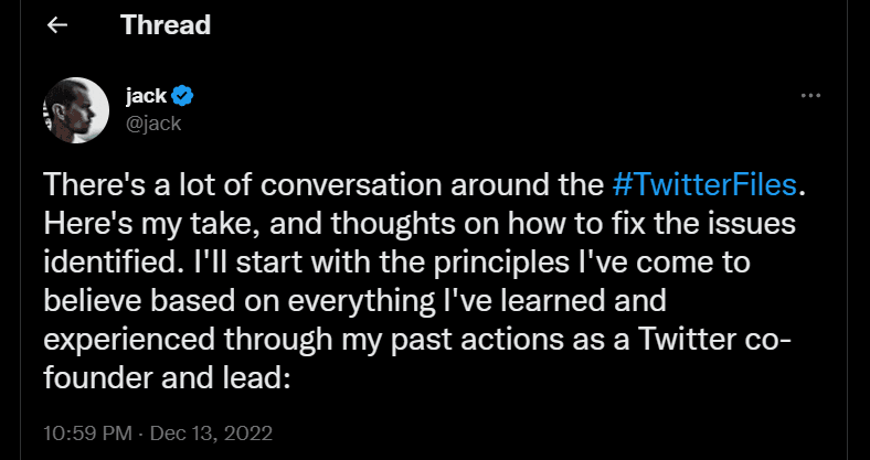 A reação de Dorsey foi feita no Twitter, onde remeteu para um texto publicado num blog. Esta resposta de Dorsey surge na sequência do caso “Twitter Files”, que trouxe à luz do dia documentos internos do Twitter que revelam a forma como antigos executivos da rede social censuraram contas de vozes conservadoras por motivos ideológicos, protegeram o então candidato presidencial democrata Joe Biden, e silenciaram cientistas de topo que se mostraram contra as medidas de combate à covid-19.