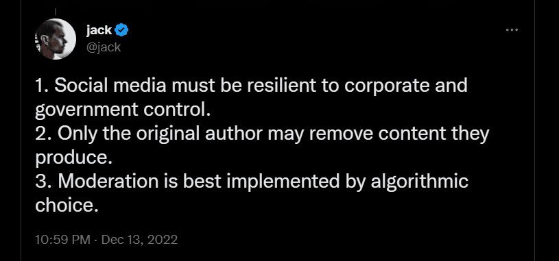 Dorsey admitiu ainda que um dos seus maiores erros foi ter criado ferramentas para que fosse o Twitter a moderar o discurso, ao invés de ferramentas para que os próprios utilizadores o fizessem. “Acredito fortemente que qualquer conteúdo produzido por alguém para a internet deve ser permanente até que o autor original decida excluí-lo”, afirmou, acrescentando que “remoções e suspensões de conteúdo não deviam ser possíveis”.