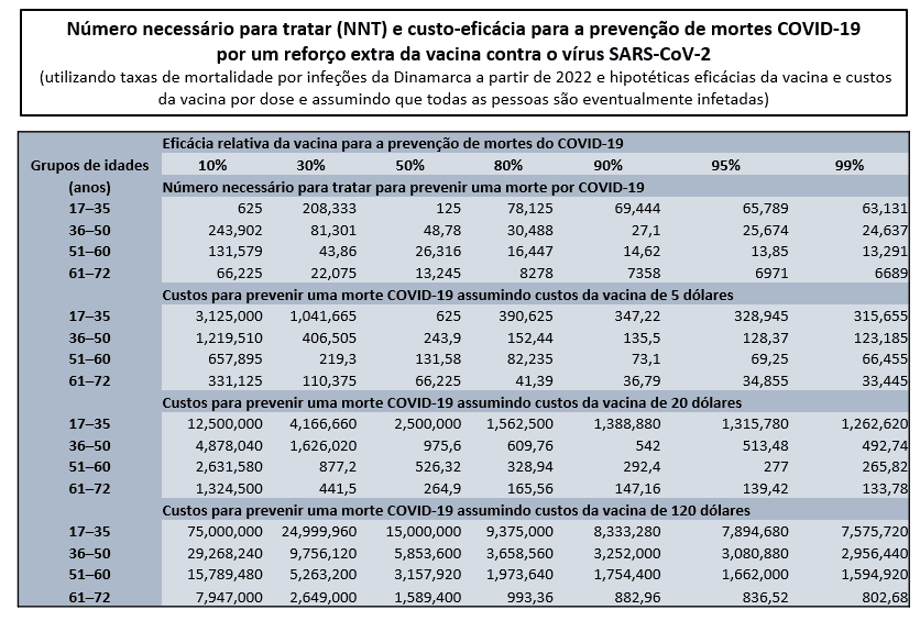 Os autores exemplificam com estimativas de custos aplicadas à situação da Dinamarca. Em geral, concluem que o número de pessoas que seria necessário vacinar (tratar) e os custos económicos envolvidos para salvar uma vida (ou evitar uma hospitalização) são agora incomensuravelmente superiores ao que ocorria nas fases anteriores da pandemia e sobretudo quando se compara com outras doenças de maior gravidade, como a insuficiência cardíaca.