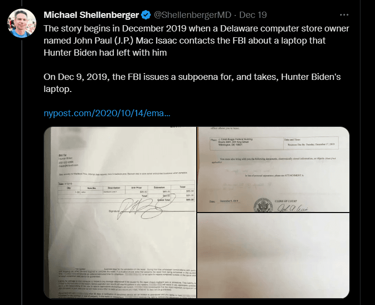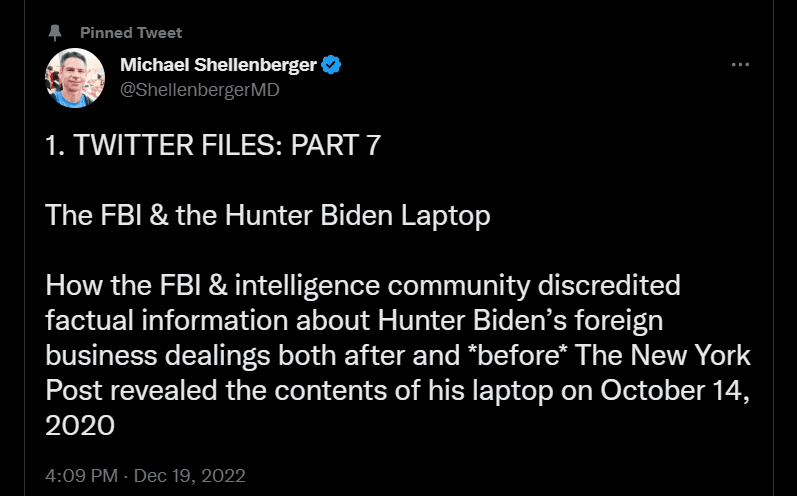 Segundo Shellenberger, o FBI pressionou o Twitter para que suprimisse a polémica história sobre o portátil de Hunter Biden, publicada pelo jornal New York Post em Outubro de 2020, que dava conta de negócios suspeitos entre o filho do actual presidente norte-americano e empresários ucranianos. ↓