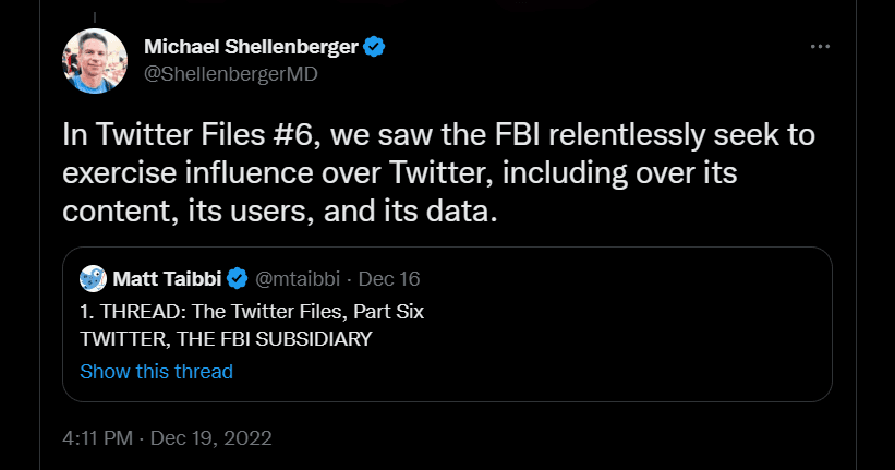 Na sétima parte dos “Twitter Files, o escritor Michael Shellenberger revelou a campanha de desinformação levada a cabo pelo FBI e serviços de informação norte-americanos junto das redes sociais, e especialmente do Twitter, e de órgãos de comunicação social para desacreditarem informação verídica sobre o caso do portátil do filho de Joe Biden, actual presidente dos Estados Unidos, que mostrava relações promíscuas com empresas ucranianas. Ficou também a saber-se que os contribuintes norte-americanos pagaram, através do FBI, mais de 3,4 milhões de dólares ao Twitter, em pouco mais de um ano, para alegadamente compensar o tempo gasto por funcionários daquela rede social a responder às suas solicitações.