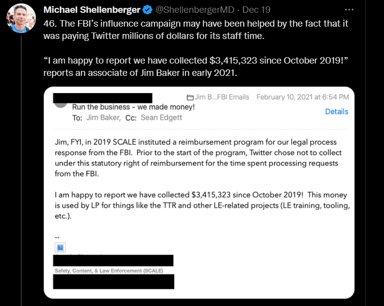 Este “processamento de solicitações do FBI” compensou financeiramente o Twitter, que conseguiu arrecadar mais de 3,4 milhões dólares em cerca de um ano. Num e-mail endereçado a Jim Baker em Fevereiro de 2021, um funcionário da rede social congratulou-se pelo montante auferido desde Outubro de 2019, acrescentando que seria canalizado para diversos projectos, alguns de carácter legal.