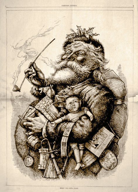 Os primeiros cartoons – desenhados por T. C. Boyd, F. O. Darley e, sobretudo, pelo anticlerical Thomas Nast – apresentavam-no quase invariavelmente com um fumegante cachimbo nos beiços.