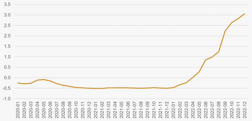 Esta loucura monetária teve obviamente consequências nefastas, com a maioria das matérias-primas a registar expressivas subidas de preços a partir do início destes “estímulos monetários”, com destaque para as energéticas, como o Petróleo e o Gás Natural que subiram 283% e 272% respectivamente, entre Março de 2020 e Dezembro de 2022.