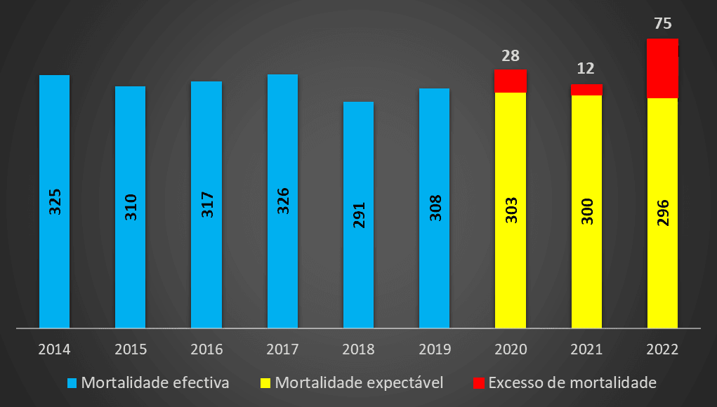 Sem pandemia, em 2021 estimava-se a morte de 300 jovens destas idades, mas acabaram por falecer mais 12. Já no ano de 2022, que agora terminou, ainda se agravou mais: seria de esperar uma mortalidade total ao longo dos meses de 296 óbitos, mas o valor suplantou em 25,5% essa fasquia: contaram-se 371 mortes, mais 75 do que seria de aguardar. Desde 2014, o máximo ocorrera em 2017, com 326 óbitos. ↓