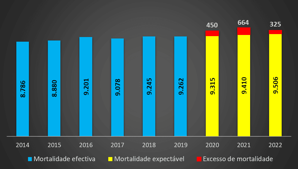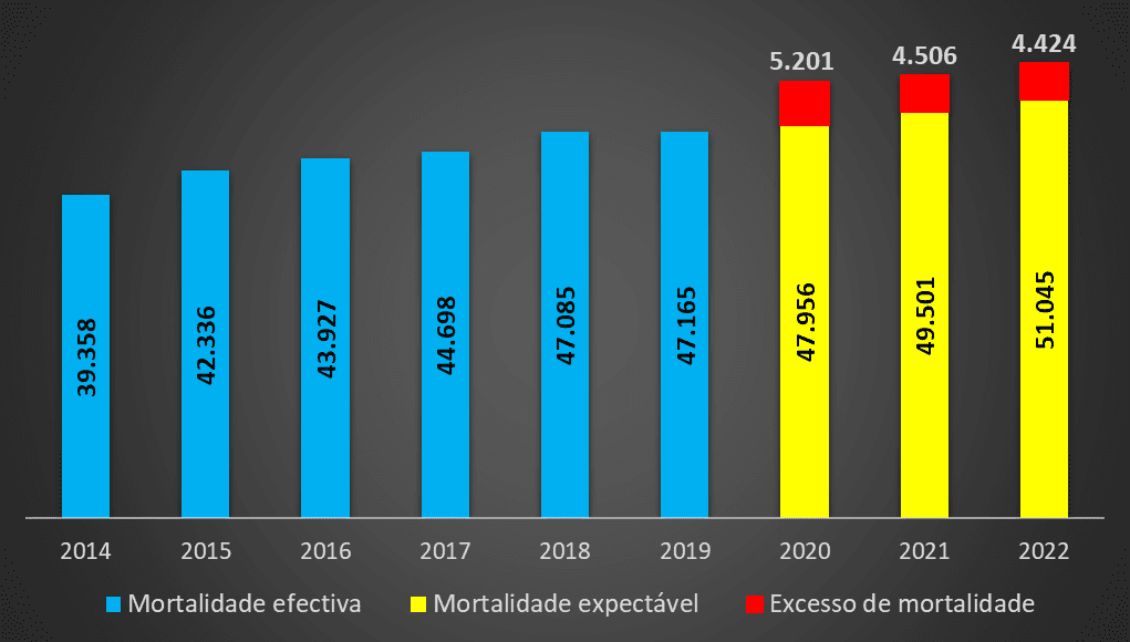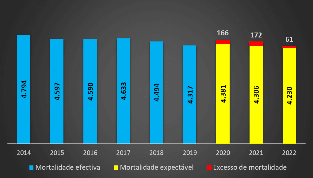 Os três últimos anos vieram, contudo, inverter fortemente essa tendência. Em 2020 observou-se um excesso líquido de 2.959 óbitos; no ano seguinte de 3.110 mortes e em 2022 contabilizaram-se mais 2.492 óbitos do que o expectável. No total registou-se assim um acréscimo de 8.561 mortes acima do esperado.