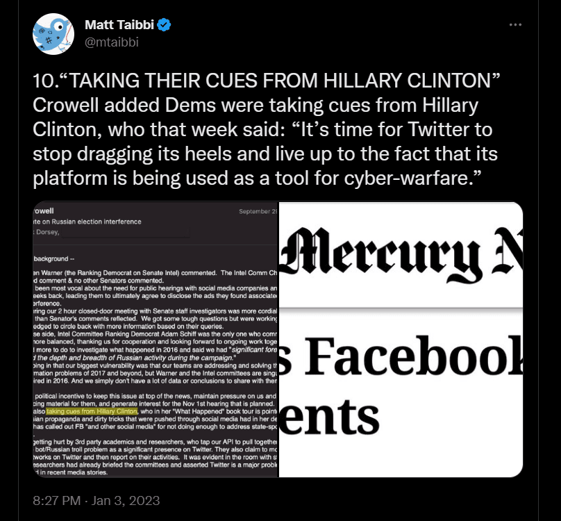 Taibbi salientou ainda que os Democratas estavam a “receber ordens” de Hillary Clinton, que tinha alegado que a rede social estava a ser usada como “ferramenta para uma ciber-guerra”.