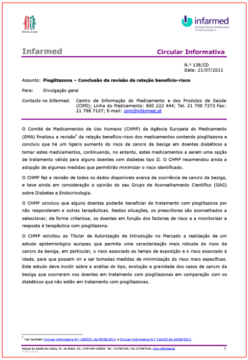 O Conselho Directivo do Infarmed, presidido por Rui Ivo Santos, somente repetiu os termos da sua circular de Dezembro passado, além de acrescentar que “a associação entre desenvolvimento ou agravamento de cancro da bexiga com a utilização de medicamentos contendo pioglitazonas é um risco já conhecido desde 2011 e já está incluído nos Resumo das Caraterísticas do Medicamento e Folheto Informativo de todos estes medicamentos, nomeadamente na secção 4.3, 4.4, 4.8 e 5.3, secções 2 e 4.”