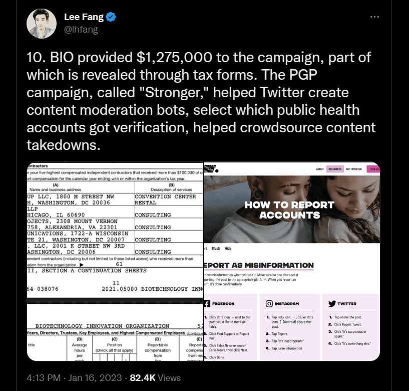 O BIO pagou um total de 1.275.000 dólares para a campanha, “parte da qual é revelada através de formulários fiscais”. A campanha, denominada “Stronger”, auxiliou o Twitter a criar bots de moderação de conteúdos, seleccionando quais as contas de saúde pública que podiam ser classificadas como “verificadas” pelo Twitter.