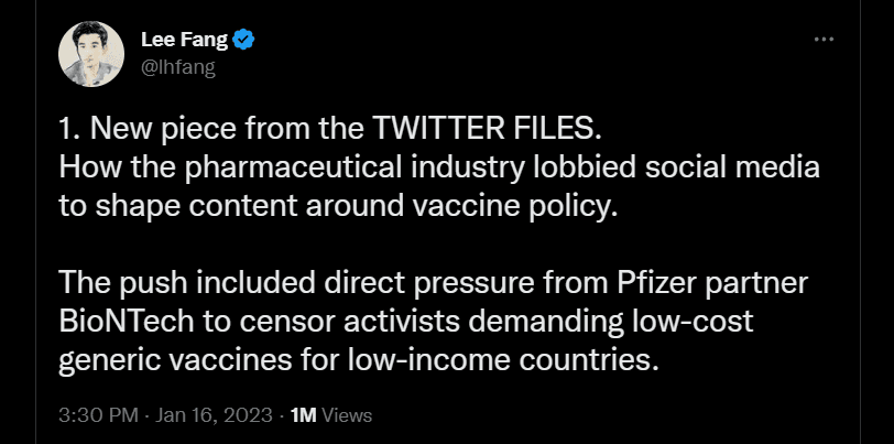 De acordo com Fang, “a indústria farmacêutica pressionou as redes sociais para moldar conteúdos em torno da política da vacina”. Segundo o jornalista, o lobby das farmacêuticas “incluiu a pressão direta do parceiro da Pfizer, a BioNTech, para censurar ativistas que exigiam vacinas genéricas de baixo custo para países de baixo rendimento”.