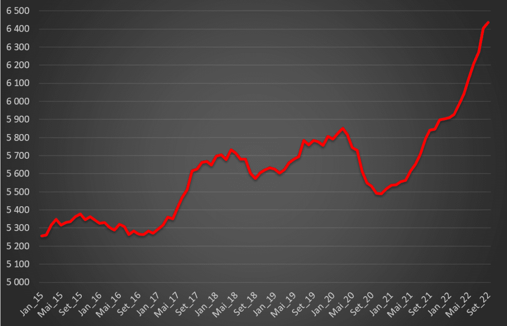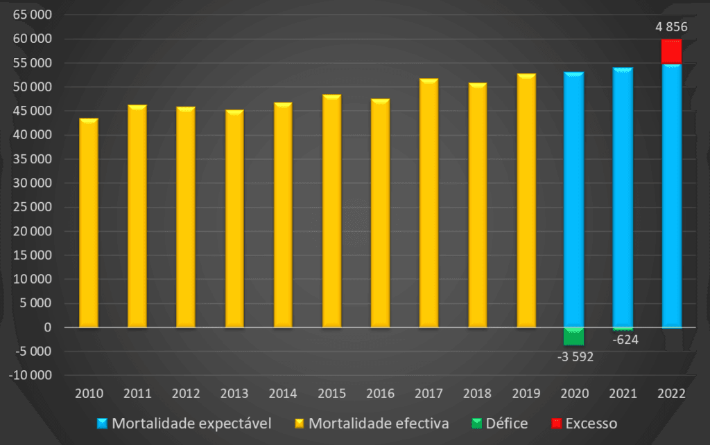A tendência de incremento da mortalidade total passou a ser preocupante quando em Novembro de 2021 se ultrapassaram os valores de Março de 2020. A mortalidade total em Setembro do ano passado – último período com dados – já se situou em 6.438 óbitos (média de 12 meses), que contrastava com os 5.786 óbitos no mês homólogo imediatamente anterior à pandemia (Setembro de 2019). Significa isto um desvio de 11%.