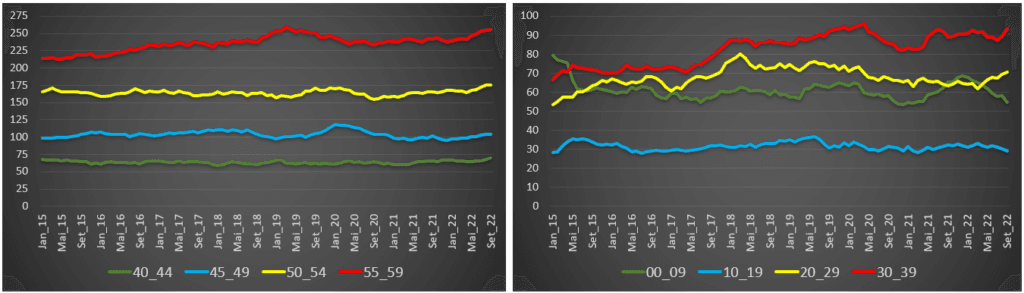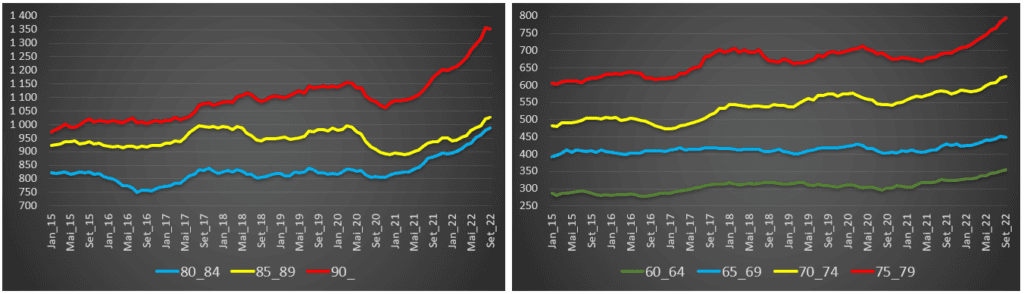 Essa evidência também se afigura no grupo etário dos 85 anos 89 anos, onde se observa uma redução da mortalidade expectável nos primeiros dois anos da pandemia, sucedendo depois um crescimento acentuado ao longo dos meses de 2022.