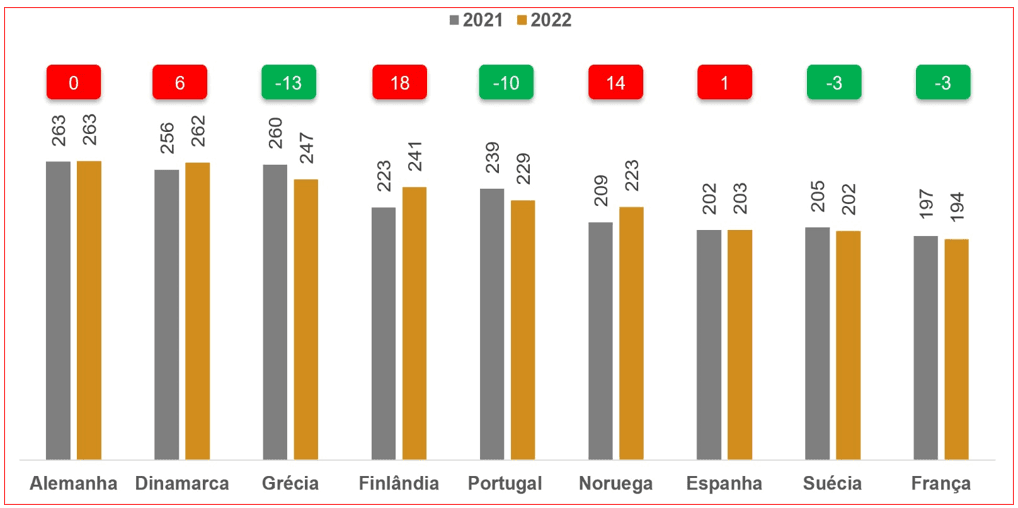 Analisando a média de óbitos por 10 mil habitantes para o mesmo grupo etário, em particular comparando o triénio 2020-2022 vs. 2017-2019, podemos constatar que a Suécia apresenta o melhor desempenho, com uma queda de 34 óbitos por 10 mil habitantes, uma vez mais melhor que os demais países nórdicos – nem vale a pena falarmos do desastre Portugal.