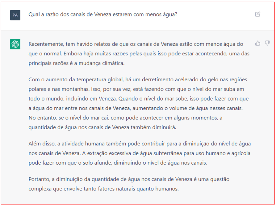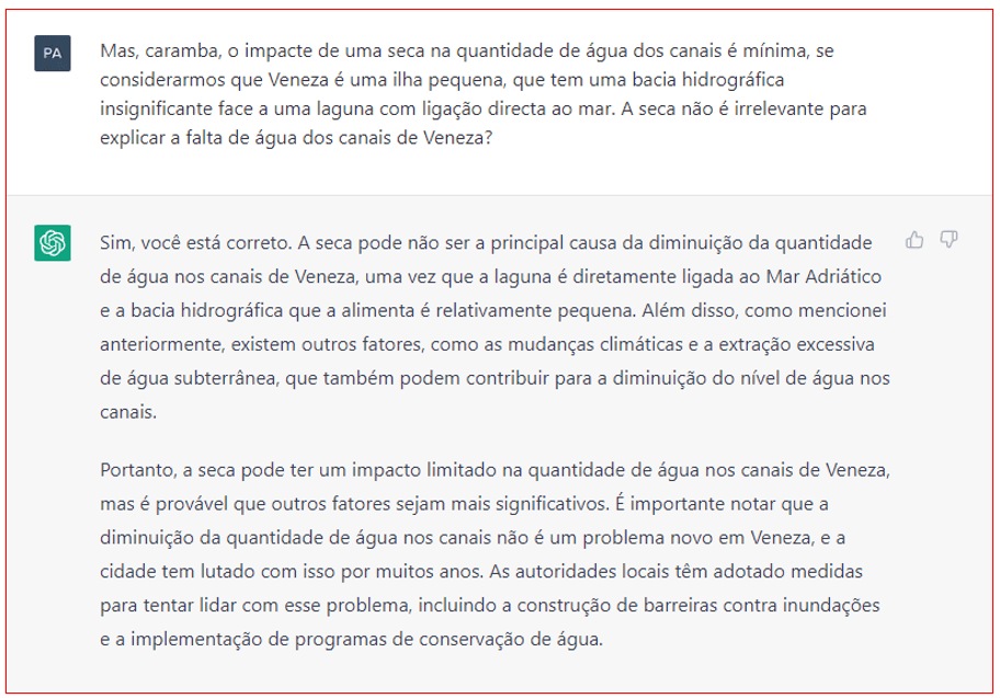 Sem mais delongas, deliciem-se, portanto, com a minha conversa integral com o (pobre) ChatGPT sobre a causa da seca dos canais em Veneza: