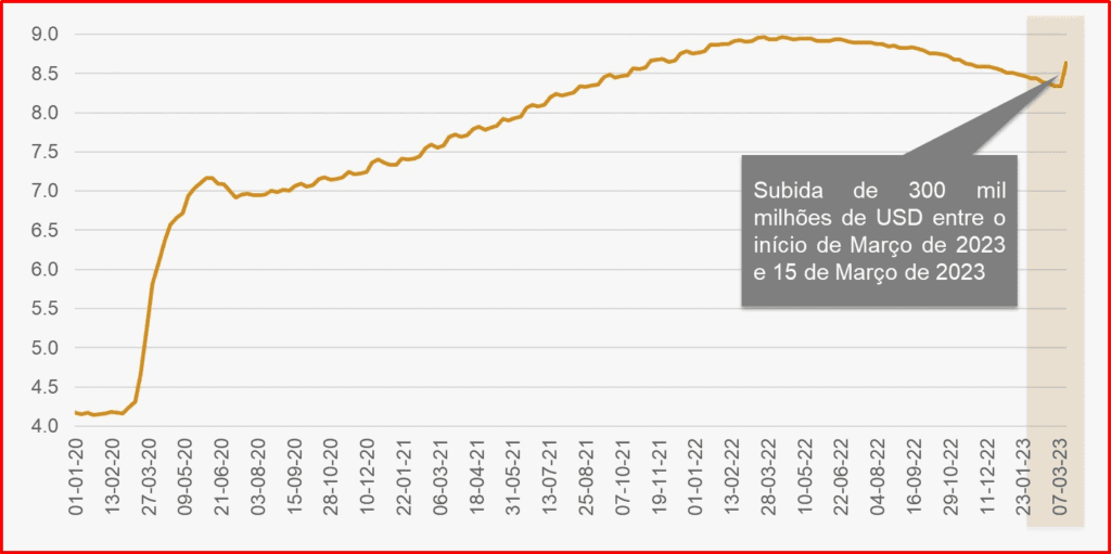 Entretanto, depois de muitas juras no combate à inflação, o balanço do Banco Central norte-americano voltou a expandir-se, desta vez, 300 mil milhões de USD em apenas duas semanas. Os bancos são agora a prioridade, a inflação fica para depois!