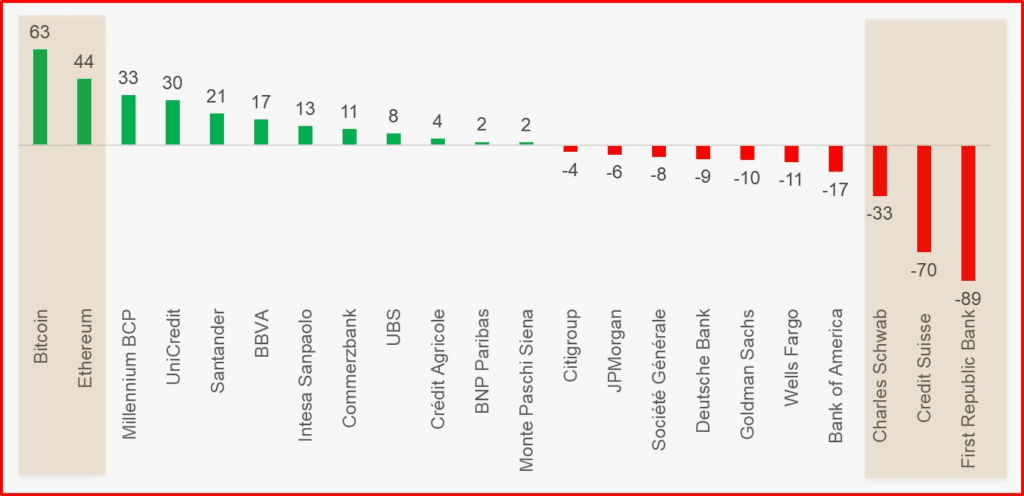Os bancos da zona Euro, como é caso do nosso conhecido Millennium BCP, todos muito obedientes a empurrar as empresas de Criptomoedas para a marginalidade, apesar da grandiloquente asserção num passado próximo: “Não vamos passar a ser um banco cripto, o cripto é que vai passar a fazer parte do BCP”, registam bons desempenhos em bolsa, passando ao lado desta crise – por agora!