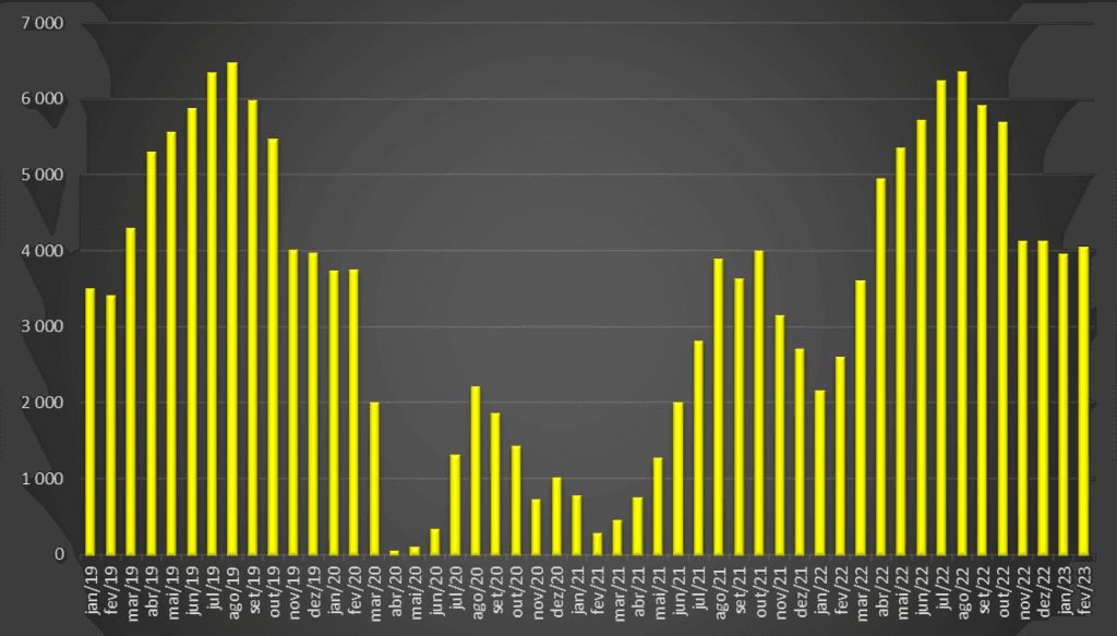 Nos meses de Outubro, Novembro e Dezembro do ano passado, os números dos passageiros aerotransportados já tinham sido superiores aos dos meses homólogos de 2019. Agora, os dois primeiros meses de 2023 também apresentam valores acima de Janeiro e Fevereiro de 2020, antes do início das fortes restrições politicamente impostas às viagens aéreas por causa da pandemia.