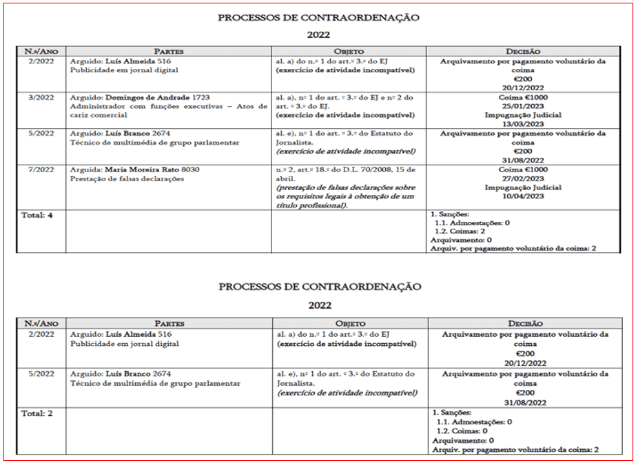 Este “apagão” promovido pela CCPJ acaba, porém, por transmitir uma falsidade, involuntária ou intencional. No documento original, com referências aos processos de Domingos de Andrade e de Maria Moreira Rato, havia a indicação da aplicação de duas coimas e dois arquivamentos por pagamento voluntário de coima ao longo de 2022; agora, o regulador presidido por Licínia Girão – e que integra outros oito jornalistas – transmite uma mentira, porque somente destaca a existência de dois arquivamentos por pagamento voluntário da coima.