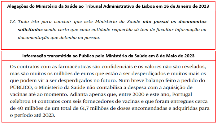 E no ponto 13 dessa alegações, na página 4, o Ministério da Saúde é taxativo: “Tudo isto para concluir que este Ministério da Saúde não possui os documentos solicitados [negrito no original] sendo certo que cada entidade requerida [de acordo com a Lei do Acesso aos Documentos Administrativos] só tem de facultar informação ou documentação que detenha ou possua”.