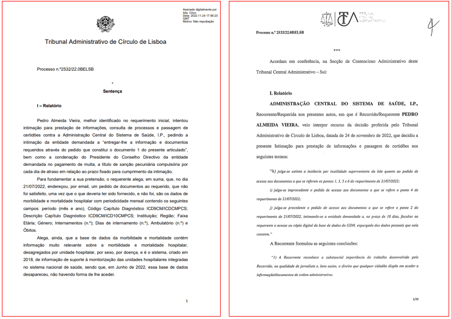 A “luta” vai, neste momento, já no Supremo Tribunal Administrativo. Esta semana, o PÁGINA UM teve de contra-alegar no recurso apresentado pela Administração Central do Sistema de Saúde, depois desta entidade tutelada pelo ministro Manuel Pizarro ter tido já duas decisões desfavoráveis. A primeira, em 24 de Novembro do ano passado, através da sentença do Tribunal Administrativo de Lisboa. A segunda, mais recente, em 23 de Março deste ano, através do acórdão de três desembargadores do Tribunal Central Administrativo Sul.