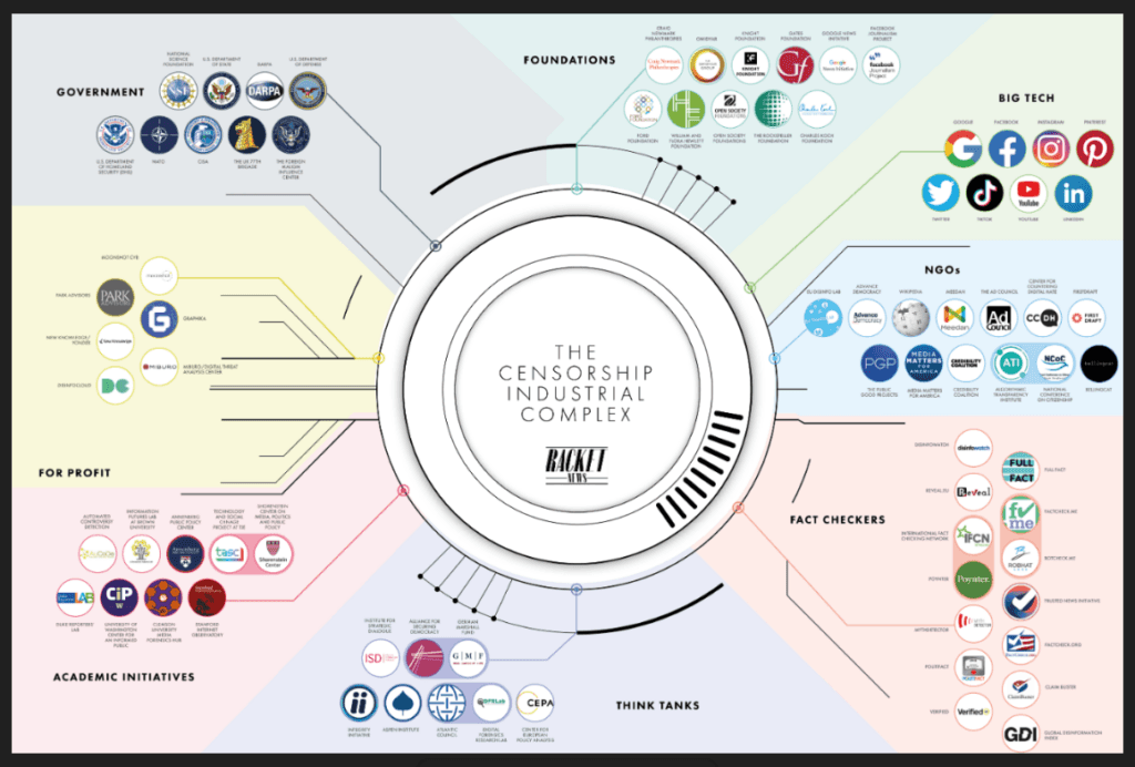 Bem, é um conjunto de vários grupos com diferentes interesses. Este sistema ao qual chamamos “Complexo Industrial de Censura” envolve associações filantrópicas, financiamento governamental e organizações governamentais, académicos, think-tanks (grupos de reflexão), organizações não-governamentais, e os media. E, portanto, há diferentes áreas onde existe uma grande coordenação. Sabemos que há um projecto intitulado Virality Project, que estava a controlar a informação que circulava sobre a vacinação contra a covid, e que admitiu explicitamente visar também histórias verdadeiras que encorajassem hesitação vacinal. E eles colaboravam de perto com o Facebook, o Twitter, o TikTok, e outros. Por isso, eu não penso que haja uma única entidade central neste complexo, mas há, sem dúvida, vários núcleos que têm procurado exercer muita influência na forma como as pessoas percepcionam o mundo.