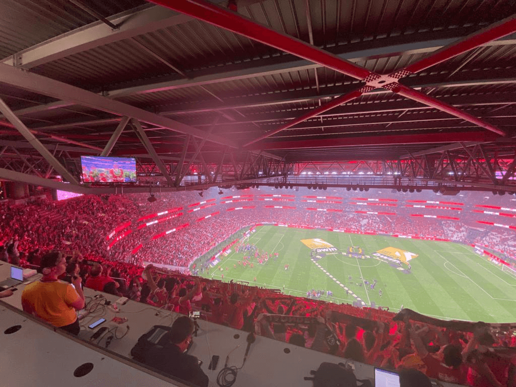 Mesmo depois disto, não soube ao certo ainda onde era a tribuna da imprensa. Quem tem boca chega a Roma, e lá cheguei, às tribunas, não a Roma, quase ao nível do Terceiro Anel do antigo estádio, mas neste, mesmo no topo, fica-se com uma visão fenomenal.