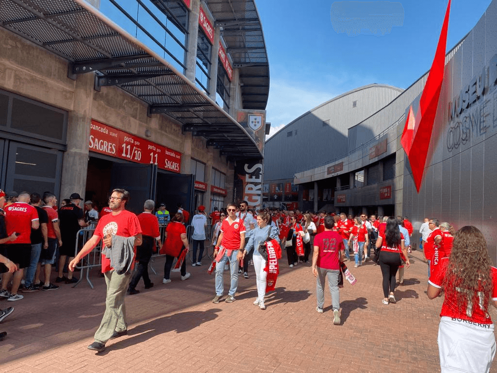 Enfim, recebida a acreditação, o habitual: apanhar metro na Baixa-Chiado, com as escadas habitualmente avariadas (incrível como a administração do Metropolitano de Lisboa insiste, qualquer que seja a equipa, pensa que nos convence das suas capacidades de gestão de um meio de transporte quando nem o raio de umas escadas rolantes mete a rolar sem interrupções constantes), e sair no Alto dos Moinhos. Um mar de gente – soa a lugar-comum, bem sei. Muito vermelho, como convém e se esperava. Até aqui nada surpreendente para um adepto – pouco assíduo desde os tempos de pandemia.