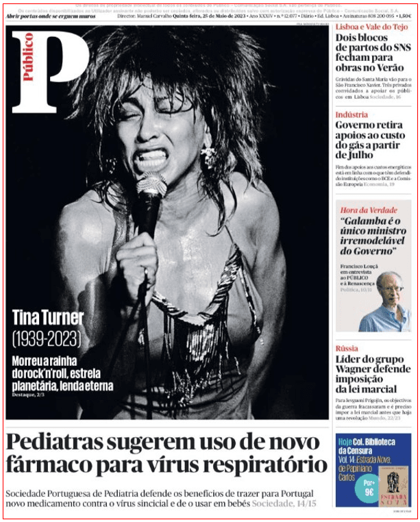 Na passada quinta-feira, em primeira página, bem por baixo da evocação da rainha do rock’n’roll Tina Turner, titulava o Público: “Pediatras sugerem uso de novo fármaco para vírus respiratório”, indicando-se, antes de apontar para a notícia nas páginas 14 e 15, que a “Sociedade Portuguesa de Pediatria defende os benefícios de trazer para Portugal novo medicamento contra o vírus sincicial [respiratório, conhecido por VSR] e de o usar em bebés”.