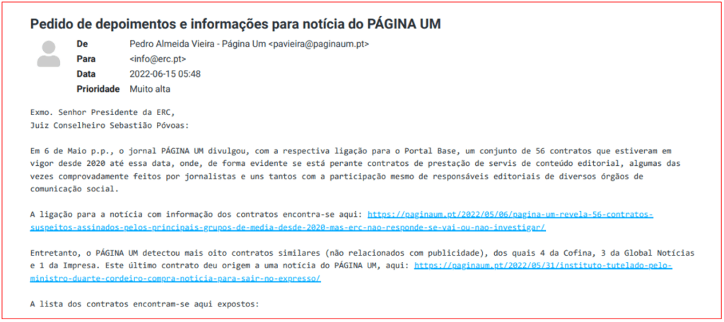 A missiva tinha como assunto explícito: “Pedido de depoimentos e informações para notícia do PÁGINA UM”.