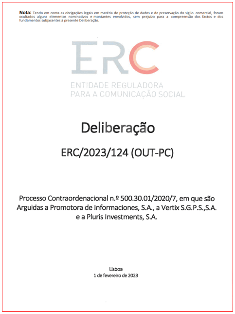 O processo de contra-ordenação, com um total de 183 páginas, foi aprovado em 1 de fevereiro, mas estranhamente só ontem foi disponibilizado no site da ERC, com a referência que por “obrigações legais em matéria de proteção de dados e de preservação do sigilo comercial, foram ocultados alguns elementos nominativos e montantes envolvidos, sem prejuízo para a compreensão dos factos e dos fundamentos subjacentes à presente Deliberação.”