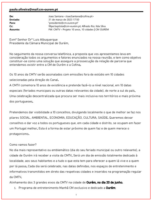 Sobretudo, acrescente-se, também por quem esteja disponível, com dinheiros públicos, a “comparticipar a execução deste dia especial na CMTV”, para o qual o director comercial da Cofina solicita “um apoio de 20.000€, investimento esse que nos permitirá suportar uma parte dos custos das emissões ao longo do dia a partir da cidade de Ourém.”