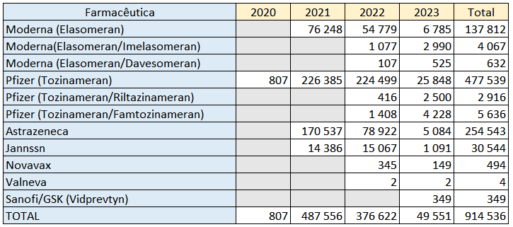 A vacina da Pfizer de primeira geração (Tozinameran) manteve o maior número, com 220 mortes súbitas associadas, seguindo-se a primeira vacina da Moderna (Elsaomeran). A Astrazeneca tem, na base de dados da EMA; 37 mortes súbitas associadas, enquanto as duas vacinas bivalentes da Pfizer oito, e a Janssen apenas cinco.