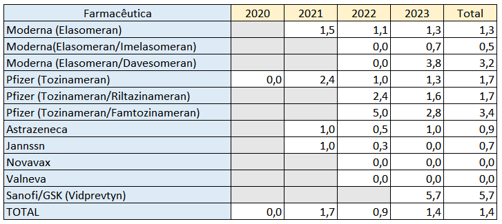 Com efeito, analisando o indicador das mortes súbitas por 1.000 casos de efeitos adversos graves até se observa um ligeiro agravamento face ao ano passado. Globalmente, este indicador situa-se, actualmente, em 1,4 mortes súbitas por 1.000 efeitos adversos graves, subindo mesmo, face a 2022, para a quase generalidade das vacinas.
