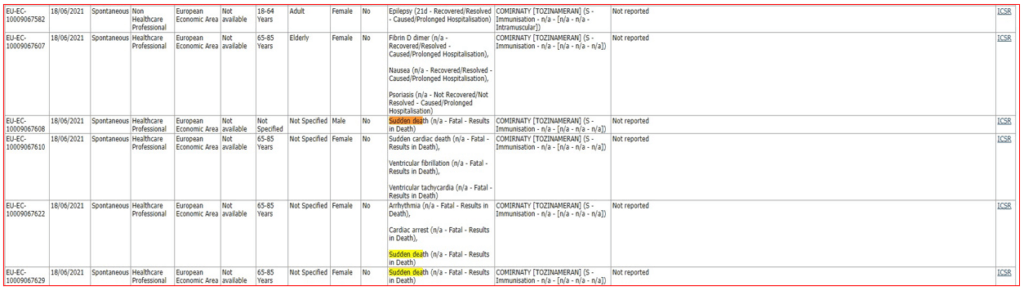 Pois bem, numa pesquisa realizada intensamente durante três dias, às 914.536 reacções adversas expostas no portal do EudraVigilance, foram inventariadas 1.241 mortes súbitas, em grande parte das quais sem sintomatologia associada.