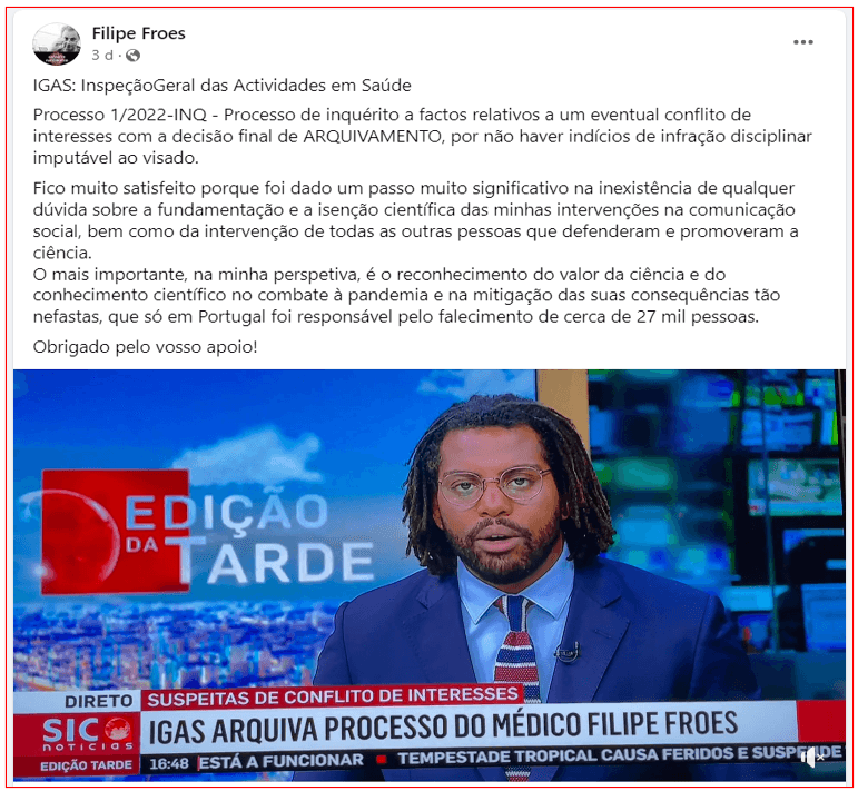 Sem prejuízo de nunca terem estado em avaliação, no processo da IGAS, o rigor científico de Flipe Froes, por não ser matéria susceptível de análise por aquela entidade, convém, contudo, recordar que o pneumologista, mesmo sendo um dos membros da equipa nomeada pela Direcção-Geral da Saúde para definir as terapêuticas contra a covid-19, não se imiscuiu de promover explicitamente medicamentos de farmacêuticas com que colaborava.