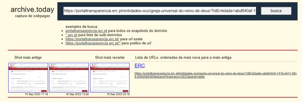 [N.D. A alteração executada pelos serviços da ERC no registo da IURD no Portal da Transparência dos Media pode ser confirmada AQUI, ou seja, pela observação dos três registos do archive.today accionados pelo PÁGINA UM na sexta-feira (uma vez] e sábado (duas vezes), sendo que o terceiro shot, em comparação com os dois anteriores, prova a modificação feita este sábado]